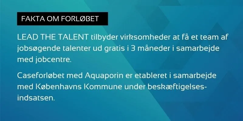 Sådan siger Sebastian Lykke Møller, der er Business Development Manager ved vandteknologivirksomheden Aquaporin i København. Han har ikke et sekund fortrudt, at hans arbejdsplads med ham i spidsen meldte sig til forløbet hos LEAD THE TALENT og nu har et ekstra firemandsteam i 3 måneder.